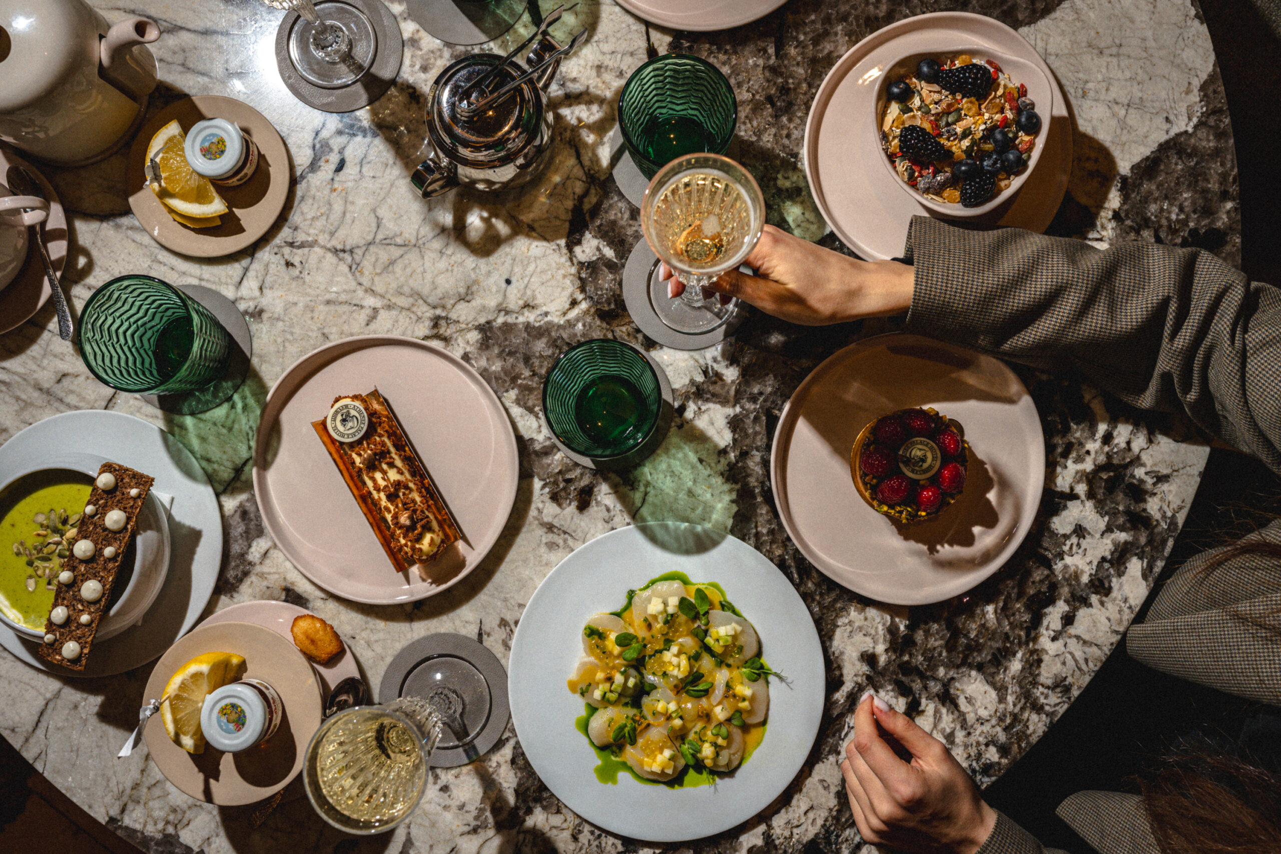 Meniul de băuturi de la Café Athénée este conceput pentru a însoți fiecare clipă a zilei. Începeți dimineața cu un fresh de portocale sau cu o cafea desăvârșită pentru micul dejun. După-amiaza, alegeți un ceai premium Ronnefeldt sau, pe măsură ce se lasă seara, savurați un cocktail rafinat. Pentru a încheia o seară memorabilă, lista noastră de vinuri alese cu grijă oferă opțiuni ideale pentru orice ocazie. Fie că vă întâlniți cu prietenii sau că vă bucurați de un moment de relaxare, veți găsi în meniul nostru băuturi care satisfac toate gusturile.